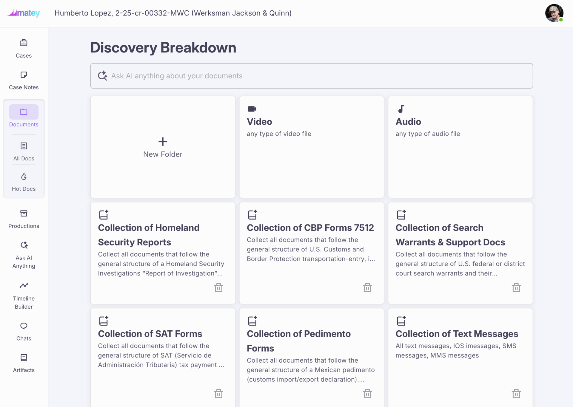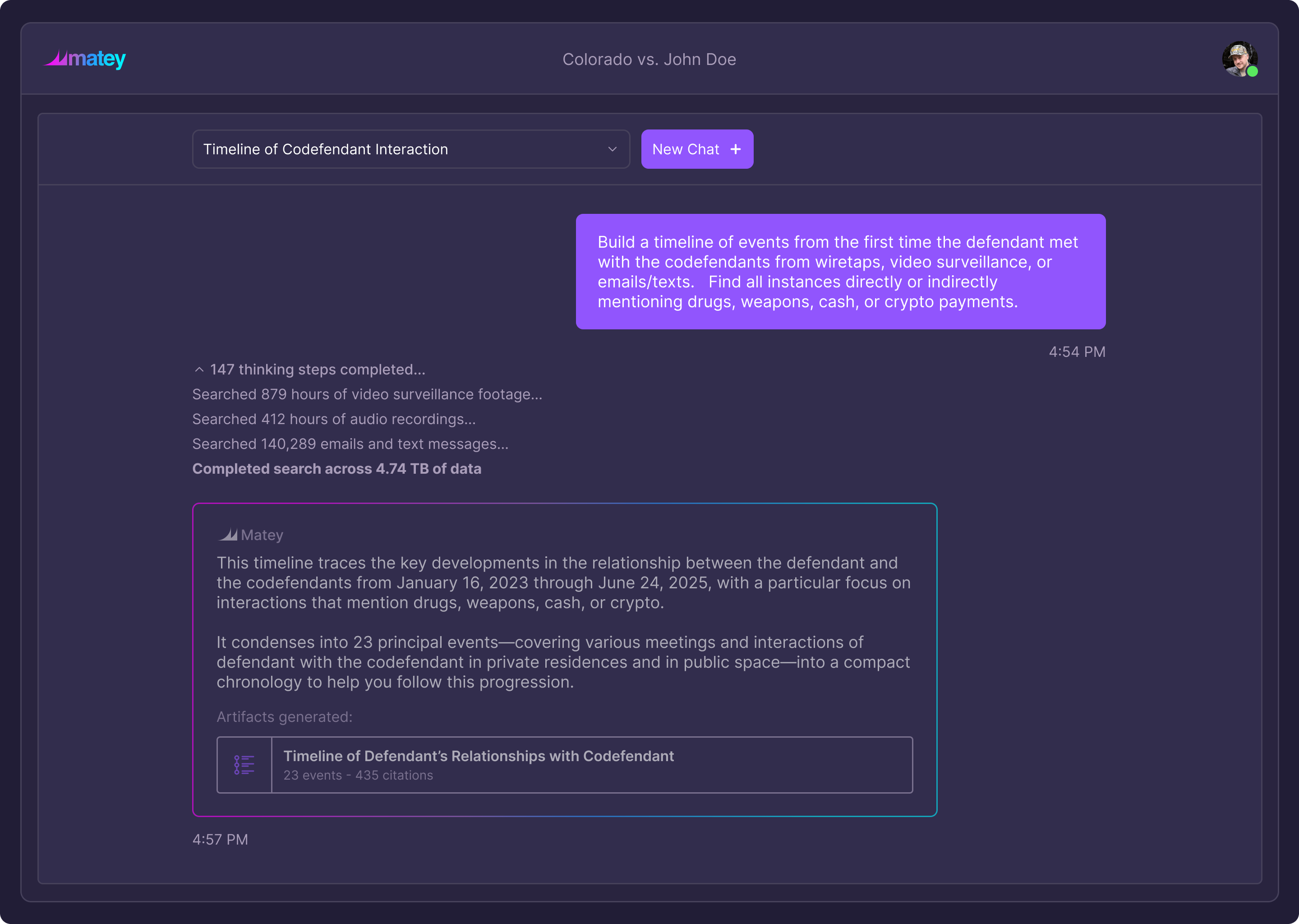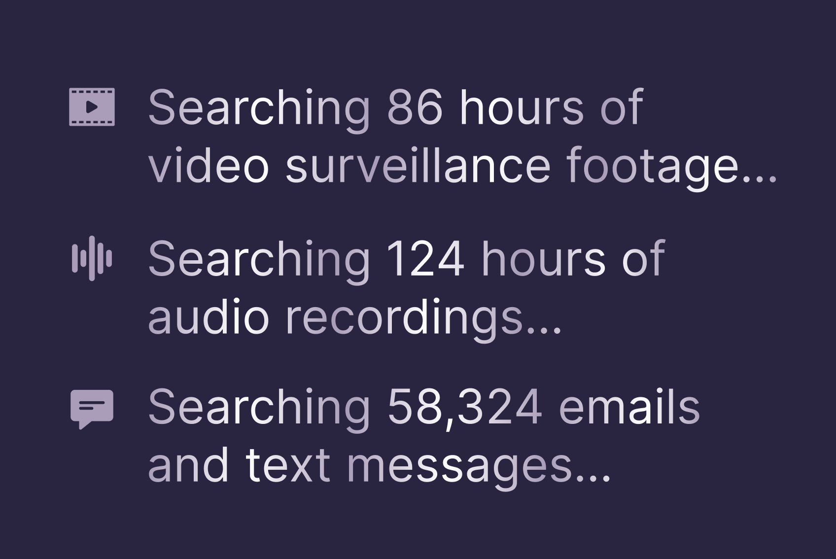 Upload all your case data, and our AI will help you connect dots across video, audio, witness statements, emails, and texts to find facts that matter.